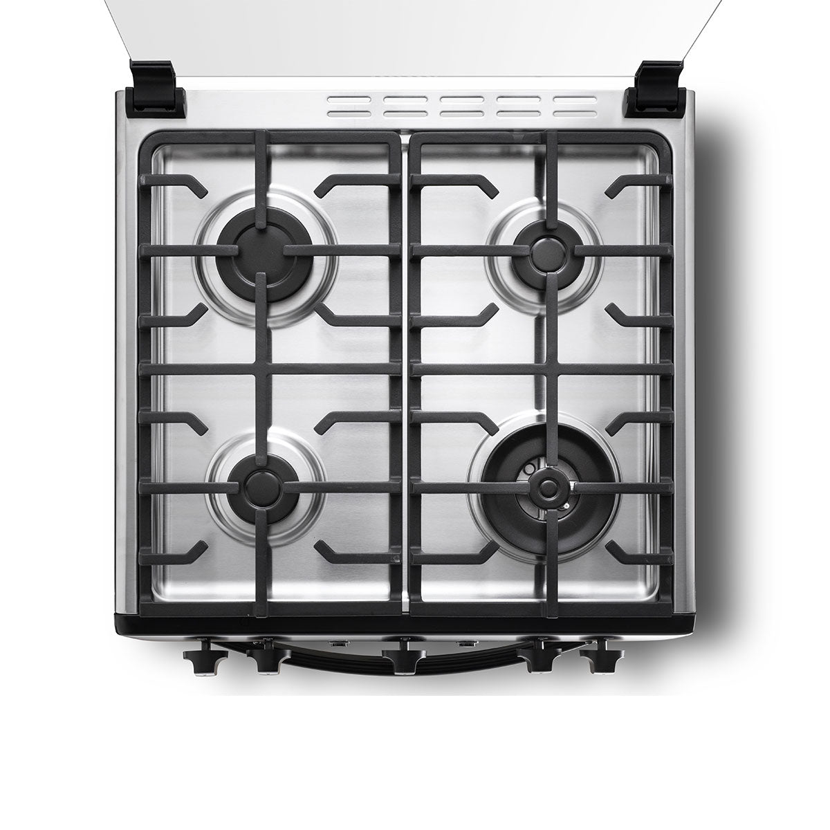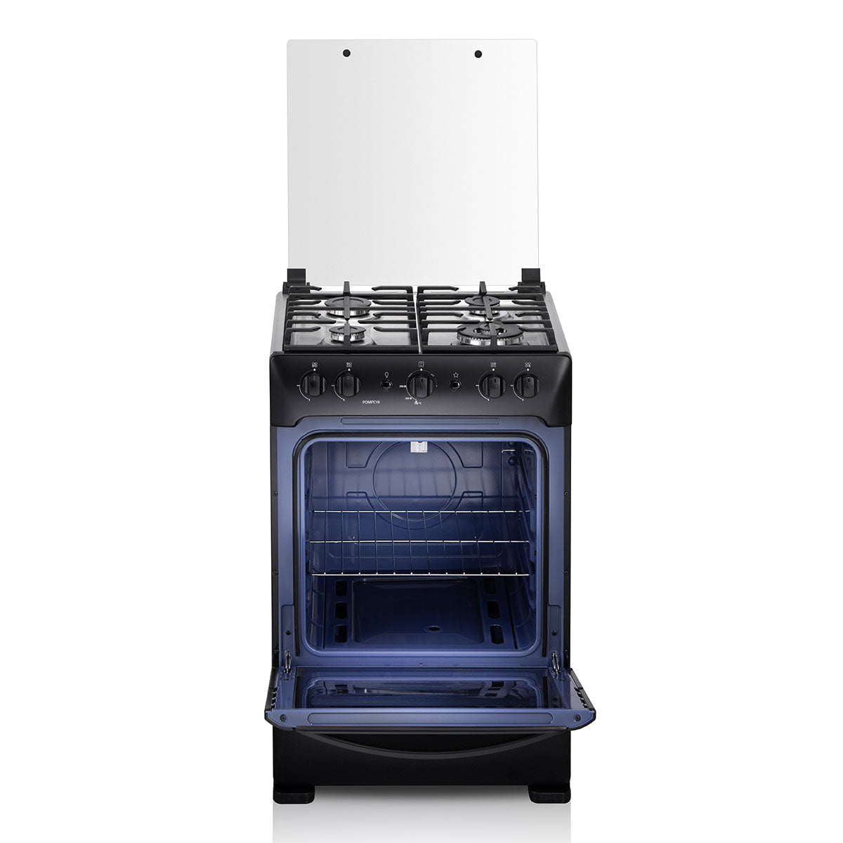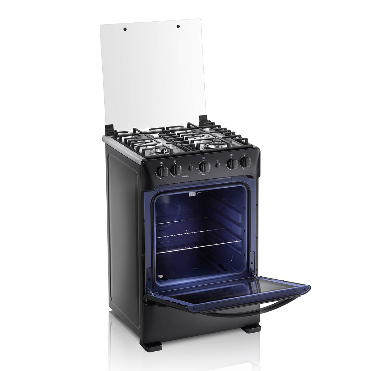 Cuenta con 4 quemadores sellados (1 quemador triple llama, 1 quemador grande y 2 quemadores medianos), tablero y frente de acero inoxidable negro, tapa de vidrio templado, parrillas fundidas, encendido eléctrico en quemadores y horno, Grill a gas, sistema termocontrol, vidrio panorámico en la puerta del horno, parrilla fija y luz en el horno.